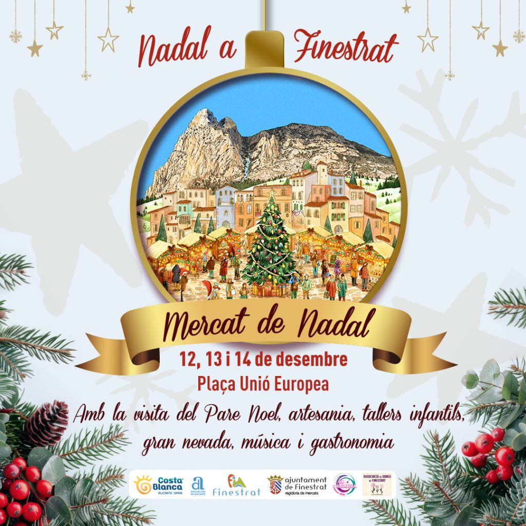 One of Finestrat’s most anticipated festive events returns on 12–14 December. The Christmas Market will open on Friday at 6:00 pm, offering family-friendly activities including craft stalls, live music, storytelling, circus and magic performances, pop-rock carols, visits from Santa Claus and his toymakers, and appearances by local groups such as the Finestrat Women’s Association, the La Xirimbela Festival Committee, local schools and Cáritas Finestrat.