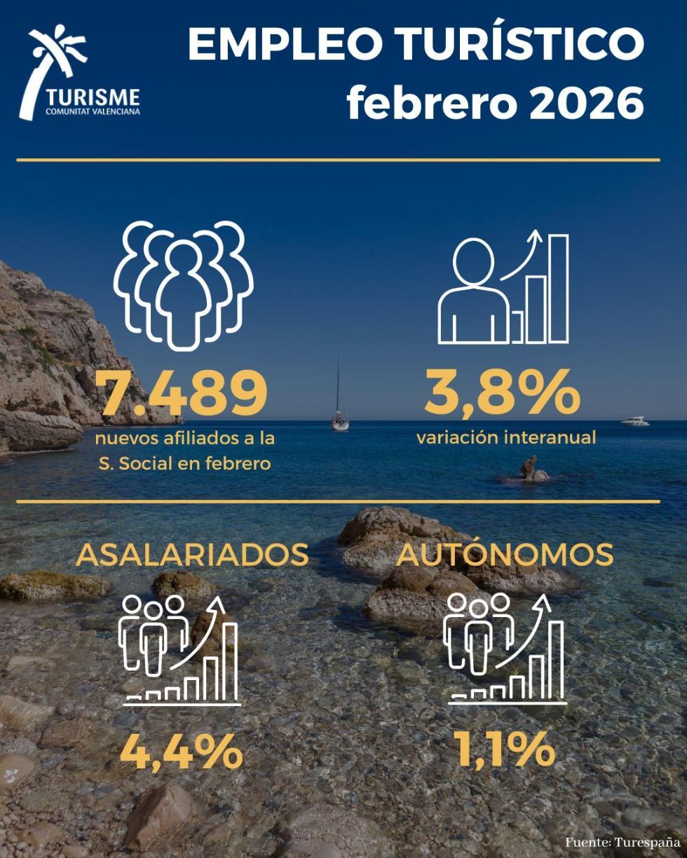Figures published by Turespaña show that employment across hotels, travel agencies and tour operators in the Valencian Community increased by 7,489 workers compared with February last year—representing a 3.8% rise, the highest growth rate of any autonomous community in Spain.